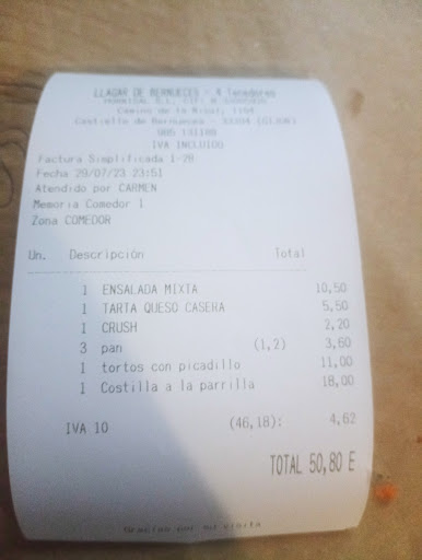 Read moreFui a una espicha de unos 60 personas con niños esta misma tarde y la sidra malísima ,tipo sidra fiesta de prao, la sangría de sidra mala no lo siguiente , en mi vida probé una sangría de sidra tan mala, el servicio pésimo x la falta de personal , luego no tenían ni un mísero pincho en la barra, si pedías un café con gotas te decían que te lo cobraban, les pedías un chupito de baylies y te ponian un chupito de crema que no era baylies y no te lo decían xo te lo cobraban como tal , después de cobrarnos 25 euros por persona por una espicha que era todo fritos de mala calidad, los entremeses malísimos , la empanada de supermercado , a excepción de las croquetas que estaban muy ricas y el postre la tarta de queso que también estaba bien , lo demás todo fritanga , el café que ponian en la espicha era de puchero y tardaron 1 hora en servirlo , con lo que la gente al final iba a la barra y lo pedía pagándolo y así, si te lo servían en el acto, En definitiva de los peores sitios para ir a comer...