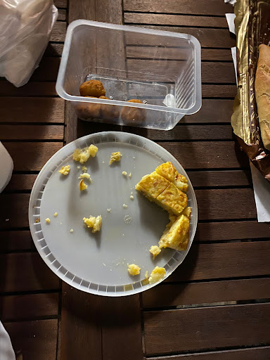 Tras comentarlo, procedimos a entrarle a la tortilla, la cual estaba sosa, cocida/recalentada y venía con sorpresa de un par de trozos pequeños de cáscara de huevo. No se si en una tortilla industrial se les puede colar algo de cáscara, pero si no lo era, es una tortilla casera malísima, seca y sin sabor alguno.