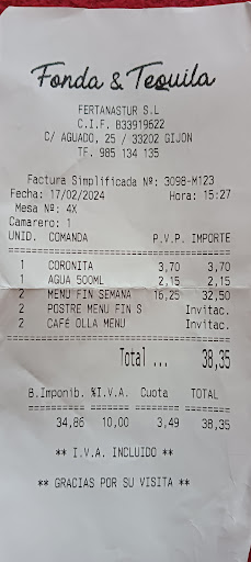 Read moreLamentable. Si estás buscando donde comer buena comida mexicana y a buen precio, este no es el lugar. Empezando por el agua de frutas, que era un zumo concentrado rebajado con agua y hielo. Los precios que aparecen en carta son bastante elevados en comparación a otros mexicanos en Asturias. Las raciones son bastante pequeñas, tienen la opción de nachitos o nachos, cuando la ración "grande" osea los nachos, es el tamaño de unos nachos en cualquier otro restaurante la diferencia es el precio (dependiendo si le añadimos, carne o guacamole) oscila entre los 20 y 30 euros, los totopos no son caseros, son los mismos que puedes comprar en bolsa en cualquier supermercado. Probamos una cazuela (había también la opción de cazuelita) de ropa vieja, la carne mechada era como de conserva y a pesar de que ponía que venía con tortillas de maíz para preparar tus propios tacos, lo que venía eran tortillas de trigo, de las que compras también en supermercado, ya que dejaban un regusto a cartón al finalizar. No tomamos postre pero viendo que la mesa que teníamos al lado, ni siquiera se lo terminó, no nos dio mucha gana. Nos fuimos pagando 50 euros y a cenar a otro sitio.