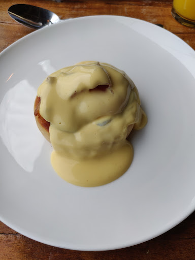 Uno de los platos fue un huevo cocido a baja temperatura con crema holandesa y dos lonchas de bacon. Este plato fue el mejor de la experiencia, aunque el bacon no estaba bien hecho, no crujía y no aportaba nada al plato. Además, el menú en internet anunciaba tortilla de patata y tostada de semillas en lugar del huevo con salsa holandesa, lo cual resultó en una discrepancia decepcionante.