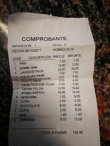 Read moreExcelente calidad del producto. Pesima atencion, pero de veras, muy mala. Y se la razon, eramos extranjeros. Recien habian abierto para cena, pero no habia espacio, lo entendi. Con tacto pedi una sugerencia de un otro sitio, queria centolla, ostras... milagrosamente, el dueño hablo con su superiora ( su mujer) y ella acepto. No eramos unos turistas para molestar. Pues con buena suerte nos dieron una mesa, luego nos mejoraron porque habia "cancelado". Yo queria centolla, mi pareja otra cosa, nunca nos presentaron una carta. Tuvimos que decirle y ahi, solo habia tuna a la plancha, muy buena. Pero no habia otra opcion? No sabemos, no la tuvo ( estuvo excelente) Duerante la cena, sigueron llegando mesas, y habia sitio para todos, que bueno por ellos. Senti desprecio y en palabras directa y clara RACISMO. Que...