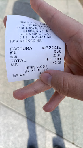 Read moreMesa reservada para tres personas a las 14 horas, nos ubican correctamente con vistas a la calle S. Bernardo. El camarero nos da las cartas y apremiante se dispone a tomar nota de los pedidos, le pregunto si nos puede decir cual es el menú del día y nos canta los primeros platos a un ritmo que para sí hubiera querido Usain Bolt. Sin enterarme muy bien de qué nos había ofrecido (y mucho menos otro compañero, forastero, a quién le gusta enterarse de lo que pide) le pregunto cuales son los segundos platos para hacer cada uno la combinación apropiada a sus gustos y la respuesta fué : "ustedes me dicen lo que quieren de primero y luego yo les digo los que hay de segundo". Por librar al camarero de su obligación de informar correctamente al cliente de lo que en esa casa se ofrece.. y por librarme de exigírselo, le pregunto si tiene el menú escrito en la carta, en cuartilla o similar para mirarlo sin molestarle.. "uy, no, aquí tenemos cuatro o cinco de primeros, otros tantos de segundo y variamos todos los días, sería imposible, no tenemos tiempo pero pueden ustedes salir a la calle, hacer una fotito al panel y decidirlo tranquilamente". Fui al baño para contar hasta 120, a la vuelta propuse a mis compañeros levantarnos, como hicimos, comimos a veinte metros de allí un menú correcto en un ambiente agradable y con un servicio perfecto. La alternativa era montar un escándalo o directamente llamar a la Policía Municipal. No conozco la calidad de su sidra o de su cocina pero, después de conocer la falta de calidad de su servicio, no voy a averiguarlo. Por mi pueden bajar las persianas para siempre en cuanto acabe la temporada de turistas, afortunadamente lo que sobra en Gijón son sidrerías donde, cuando menos, no llegan a...