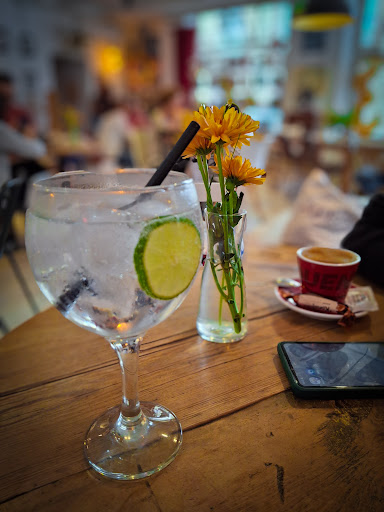 Read moreLugar agradable . Cafetería y lugar para tomar cafés y otras bebidas como infusiones , cerveza, etc .Lugar de lectura y venta de libros y algún cómic de actualidad .Lugar de reunión para todas las edades, especialmente gente jóven . Decoración que combina un aire industrial moderno ( lámparas largas con pantallas opacas grandes metálicos en zona de la barra ) con toques rústicos y guiños retro "vintage . Decoración con objetos que lo adornan y que aluden al un gusto explícito al mundo cinematográfico , se respira una atmósfera , lo que me aporta un aire más agradable y acogedor .En la entrada aparecen numerosos carteles en relación al compromiso social , actividades culturales y temas de actualidad . Atmósfera intelectua.Por la noche ponen disponen de un discman para poner música .El estilo de música varía según la gente que haya , momento y hora . Parece que la música la ponen los fines de semana o en algunos días en concreto . Precios medio razonable .Un café con leche mediano 1' 50 euros . Ni caro ni barato . Buen...