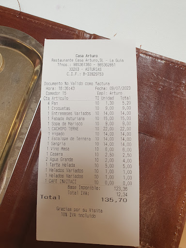 Read moreEl trato por parte de quien no quiero pensar que fuera el dueño ,fue una falta de educacion total y absoluta . Los bocadillos tanto de tortilla (de la cual sé le habia pedido al camarero que por favor pasára un poco más el huevo ya que nos gusta pasado u no crudo) 4Euros El bocadillo de calamares déja mucho que desear 5 euros . Mi reclamo iba dirigido al camarero pero como intervino el señor (supuesto dueño) en la conversacion de muy malos modales ,le pedi la hoja de reclamaciones al mismo y me responde que tiene un coste ,mientras va a buscarla ,cuando vuelve le digo cuanto cuesta y me responde que no se la entregue . Todo se hubiera resuelto si me hubiera calentando o pasado un poco más la tortilla ya que en muchos sitios sé mete en el microondas y listo ,pero la falta de educacion no la aguanto y ni la paso por mucho que sea casa Arturo o casa del Rey y la gente debe saberlo o es que estaba muy agobiado o la edad de tantos años llevando un negocio ,debe pasar factura y si fuera asi ...relevo generacional!! . EL SITIO ESTÁ BIEN PORQUE TIENE UNA AMPLIA TERRAZA ASI PUDE OBSERVAR PERO SÓLO PARA TOMAR ALGO AL MENOS ME DI CUENTA CUANDO LA GENTE VI A L SÓLO TOMANDO SIDRA ,AL MENOS ÉSE DIA. NO SÉ PREOCUPE QUE NO VOLVERÉ Y NI TAMPOCO LO RECOMENDARÉ. QUE SUPONGO TAMBIEN QUE LE...