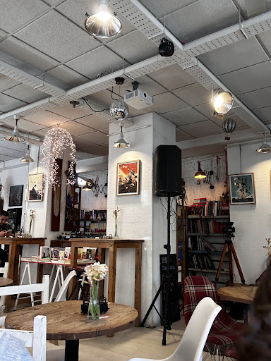 Read moreLugar agradable . Cafetería y lugar para tomar cafés y otras bebidas como infusiones , cerveza, etc .Lugar de lectura y venta de libros y algún cómic de actualidad .Lugar de reunión para todas las edades, especialmente gente jóven . Decoración que combina un aire industrial moderno ( lámparas largas con pantallas opacas grandes metálicos en zona de la barra ) con toques rústicos y guiños retro "vintage . Decoración con objetos que lo adornan y que aluden al un gusto explícito al mundo cinematográfico , se respira una atmósfera , lo que me aporta un aire más agradable y acogedor .En la entrada aparecen numerosos carteles en relación al compromiso social , actividades culturales y temas de actualidad . Atmósfera intelectua.Por la noche ponen disponen de un discman para poner música .El estilo de música varía según la gente que haya , momento y hora . Parece que la música la ponen los fines de semana o en algunos días en concreto . Precios medio razonable .Un café con leche mediano 1' 50 euros . Ni caro ni barato . Buen...