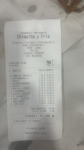 Read moreUna marisquería a la altura de cualquiera de Sevilla capital pero a mejor precio. En sitio es pequeño, es recomendable reservas y mas con el covid que tienen menos mesas aunque tienen unas mesas fuera donde alomejor se pueden sentar. El personal es atento y rápido, como la cocina, platos de calidad preparados al momento, la mayoría de su carta son platos de producto mas que de preparación asi que la calidad y frescura de este es importantísimo y lo saben, la preparación que le dan al producto es la mínima para disfrutar del producto sin que lo empañe la cocina. La carta obviamente cambia constantemente aunque la ensaladilla, papas aliñás y bambas siempre están presentes. La carta de vinos es correcta como los postres que los tienen expuesto en una nevera juntos a la barra y la cocina. En resumen, si estas por la zona y te apetece algo de mar...