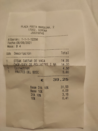 Read moreLa comida exquisita, y la relación calidad precio muy buena. De primero un steak tartar de vaca madurada, que lo preparan en barra y si tienes la suerte de estar en barra ves como lo preparan, el señor que lo prepara un maestro y la camarera me preguntó el punto de picante puedes elegir de 0a10, y me aconsejó el punto perfecto de picante, tras decirle mi gusto, este plato muy top, muy muy top! Aconsejado y un precio 14,95 ridículo para la calidad que tiene. La pega ha sido la experiencia, yo he ido sola, he ido a la hora de apertura, un miércoles por la noche, la intención era cenar rápido algo rico, iba al sitio por recomendación. Al principio contenta con el trato el malentendido ha sido con el segundo plato que yo había pedido un morro de bacalao con menta y no sé el nombre completo pero al dudar entre ese plato y otro y comentarlo con la camarera al final me han traído el que no quería, recuerdo la conversación porque la camarera me dijo que no era muy de pescado y al elegir yo el pescado le he comentado que al final no le he hecho caso, y al llegar el segundo a mesa le he preguntado qué que había pedido y me ha dicho esto y le he dicho creía que había pedido lo otro y me ha enseñado la comanda que había apuntado ella y ya se da por zanjado el asunto, tampoco era cuestión de quejarme más o de mala manera pero se lo he repetido a la camera mi decepción por este segundo plato, además ponen un aperitivo mientras toman nota, muy correcto pero a mi entre que he ido la primera y he cenado sola, quizás, me lo han traído después del primer plato cuando se lo estaban sirviendo a los demás clientes, ya que estaba en barra viendo cómo lo preparaban y la camarera muy maja se ha disculpado y me lo ha traído. El postre no ha sido lo más destacable he pedido su versión de frutos rojos que venía con panacota, pero la panacota apenas tenía presencia , nada que quejarse ya que no venía en el nombre de plato , así que eran unos frutos rojos correctos, ricos...