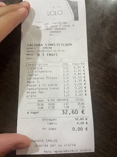 He ido con dos amigos a comer, fuimos a un bar y preguntamos por la carta y por los precios, nos enseñaron un cartel con los productos que vendían y no venían los precios, al preguntar otra vez por los precios eludieron la pregunta. Finalmente decidimos darle una oportunidad y nos mandaron a un bar que hay justo al lado, volvimos a preguntarle a la camarera por la carta y otra vez nos dijo que no tenían, nos dijo sus productos recitándolos. Es cierto que ahí no preguntamos los precios, no lo vi necesario ya que no me imaginaba precios abusivos en un bar de barrio de Granada. Pedimos una ración de calamares fritos y recibimos un plato con aritos de calamar congelados, se que no estamos en la costa y que no habría pescado fresco, pero nuestra mala sorpresa llegó al ver en la cuenta que dichos calamares valían 16 euros, unos calamares congelados en un barrio obrero de Granada. La camarera que nos atendió fue super amable en todo momento y no tenemos ningún problema con ella sino con el dueño que pone precios abusivos en un bar sin carta.(repito que preguntamos por la carta en dos ocasiones, una carta debe incluir precios, no es un listado de platos sin precios puestos en un cartel pegado en la pared) Puedo decir que se de lo que hablo ya que trabajo en la hostelería desde hace años y en este momento trabajo en un restaurante situado a 30 metros de la mezquita de Córdoba y tras aumentar los precios por la inflación vendemos el surtido de pescado frito de Cádiz (pescado fresco y no congelado) a 15 euros y aquí nos han estafado al pagar 16 euros por calamares congelados en un...