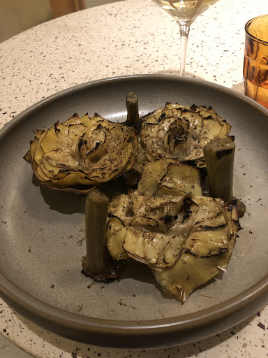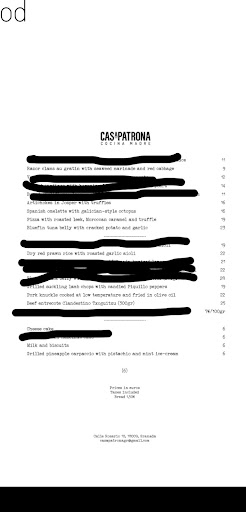 Read moreCasaPatrona is my favorite restaurant of all that I’ve been to in Granada. I came here a second night in a row, after they absolutely blew my away, and the second night was perhaps even better, because I tried so many more dishes, and every single one was spot-on delicious. Day 1, I got to try a Tuna Belly Carpaccio on a bed of garlicky potatoes pressed into a skillet to make a sort-of rosti. Reminded me of childhood, eating roasted potatoes with salty, almost raw fatty cured fish. I was also brought a sort of small lamb burger as my tapa. Then suckling lamb chops, a specialty in Granada that were cooked on a charcoal grill with red peppers. Both tasted fantastic, my server Luis did an excellent job suggesting an excellent red wine pairing. My second night, my tapa was a small Salmorejo, my favorite summer dish in Andalucía. I got the most amazing artichokes I’ve had in my life, cooked in a charcoal grill, and with a fragrant fresh black truffle grated right in front of me. A slow-cooked pork knuckle slid right off the bone, was perfectly seasoned and moist, with grilled asparagus cooked to perfection. I also enjoyed the bone marrow out of the thick knuckle bone. I got the partridge paella, with braised lemons and snow peas, which took a while, but was 100% worth the wait. It was so delicious I scraped the paella pan with my spoon clean. The artichokes were paired with the 2023 white wine in the photo, a light effervescent pairing that made them pop, and then the latter two dishes I enjoyed alongside the pictured 2020 red, a sweet, balanced fruity wine that was very enjoyable to drink. As a dessert, I got a carpaccio of smoked pineapple, with pistachios and pistachio-mint ice cream, which I found absolutely delightful. Both times the meal was finished with a chupito of Orujo with herbs, that is sweet and super easy to drink, and could be a dessert of it’s own. Luis expertly heated a snifter with boiling water before pouring a taste of brandy in it, the only right way to enjoy brandy in my opinion, and I loved every single thing. Don’t miss this place when you come to Granada, it was truly worth every second, and I wish I’d discovered it sooner. I have Michelin star restaurant experience, and the level of excellence is truly on par. If you only go to one place, come here. 10/10. Thank you, CasaPatrona