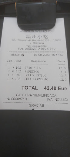 Read moreEste finde teníamos ganas de probar algo diferente, así que unos dias antes nos dimos a la tarea de buscar algo en la ciudad aprovechando que en verano es más fácil ir sin reserva a los restaurantes, nos decidimos por este restaurante porque tiene comida tradicional china y fue toda una experiencia, muy positiva de verdad. Nada más entrar, se agradece que la decoración sea sencilla, fresca y limpia, nada de espacios apretados o recargados como los restaurantes chinos de toda la vida en España. La atención por parte del personal genial, amables y muy simpáticos, nos dieron el tiempo de elegir mientras respondían a preguntas sobre los platos. La comida fue toda estupenda, pedimos puré de taro a la plancha, son patatas chinas que aunque no fueron nuestras favoritas, si tienen un sabor muy muy diferente a lo que puedes probar aquí, vienen en una salsa y con muchas verduras picadas. También pedimos pollo crujiente, con una salsa espectacular, a pesar de ser un pollo frito, no estaba nada grasoso, tenía un sabor muy especial. Finalmente pedimos lo que podría ser su plato estrella, gongbao jiding, que es pollo con verduras y cacahuetes, picante y con un sabor muy intenso y especial, nada que haya probado se le parece así que no puedo comparar, pero definitivamente será algo que pidamos cada que volvamos a ir. La comida ha sido suficiente como para salir muy satisfechos, el último plato nos costó terminarlo y creemos que los precios de cada uno, a pesar de ser más caros que en los restaurantes chinos de la ciudad, se pagan con gusto pues no estás comiendo un chino de imitación, sino auténtica comida china, con ingredientes frescos y muy buena cantidad. Debemos decir, que nada más entrar y que de 4 mesas que había ocupadas en ese momento, dos sean de familias chinas comiendo allí, ya es una buena señal de que se comerá algo realmente tradicional chino. Salimos muy contentos ( y rodando jaja) seguramente volveremos, la siguiente...