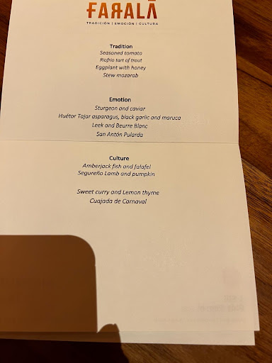 Read moreI booked Farala for our 10th wedding anniversary, I wanted something a little special and Farala did not disappoint. We had the Magic of Albayzin tasting menu with the wine pairing option (10 passes). We were early arriving as we had attended the Flamenco show downstairs, this was spectacular and highly recommended before dinner. This gave us the opportunity to relax in the wine bar before dinner. The staff in the wine bar were very knowledgeable about the wines and when we were ready ushered us smoothly to the restaurant. The restaurant has a lovely relaxed ambiance and from the moment we walked in the staff were attentive and polite. We were attended to by the same two staff members all evening their attention to detail was lovely to see and made for a special evening. For example both plates of food were placed on the table at exactly the same time. The dishes themselves were works of art and joyful to see. A brief but concise description of each dish was given and advice as to how to eat them and in which order, pure theatre. Additionally the wine pairings were briefly introduced and the measures were very reasonable. During the meal the staff were very discreet and we did not feel at all rushed. In all I think we were seated for close to 2.5 hours and left feeling incredibly relaxed and that we had a most wonderful experience. Date of visit...