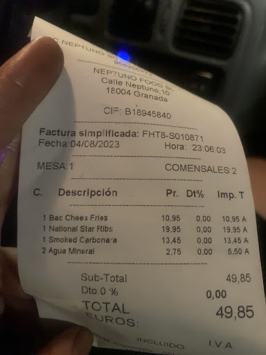 Read moreLe pongo una estrella porque no puedo ponerle ninguna. La primera vez que fuimos las costillas estaban resecas, frías y no tenían de nada para la guarnición. Hoy hemos decidido darle una segunda oportunidad, y todo ha ido de mal en peor. Para empezar mis cubiertos estaban sucios, cosa que me los han cambiado sin más y no le dimos mucha importancia. A la hora de pedir la comida pedimos que por favor nos trajeran todo a la vez; unas patatas puled y dos de costillas. De hecho la muchacha ni nos preguntó qué queríamos de guarnición y se lo tuvimos que decir nosotros. Nos trajeron unas cotillas primero; nos las acabamos y el entrante sigue sin venir. Acto seguido nos traen las siguientes costillas resecas y le decimos que nos faltaba el entrante aún, cosa que nos dicen que estaba por salir. A los 5 minutos nos traen el entrante con el queso sin fundir (que tampoco dijimos nada) y fué empezar a comérnoslo y para nuestra sorpresa nos encontramos un cacho de plástico bastante grande. Llamamos a la camarera y se las lleva sin decirnos si nos va a poner otras o si no nos la va a cobrar o algo. Nos terminamos las segundas costillas; llamo a la camarera y le digo que si nos están haciendo otras o algo, y me dice que sí, a lo cuál le dije de que ya no queríamos el entrante, porque ya habíamos comido los dos platos; por lo tanto se disculpó y le pedimos la cuenta. A la hora de cobrarnos la chica nos preguntó si queríamos las patatas y nos las llevábamos, cosa de que no íbamos a estar arrastrando con las patatas por todo Graná. Y para rematar no tenía ni cambio y tuvimos que dejarlo como "propina" encima de todo. En fin, todo fatal, no...