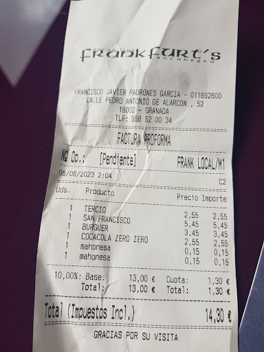 Read moreEl Frankfurt's Bocanegra de la Calle Pedro Antonio de Alarcón en Granada, no es ni más ni menos que una bocadilleria normal: tiene salchichas en pan, sándwiches y bocadillos de diferentes ingredientes.