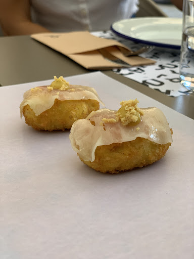2️⃣ Croquetas de ají de gallina ibérica (4€, 2 piezas) unas croquetas súper cremosas de Ají de gallina, un plato típico de la cocina peruana, con un velo de papada ibérica y polvo de torreznos. Una auténtica bomba si eres un croquetas lover