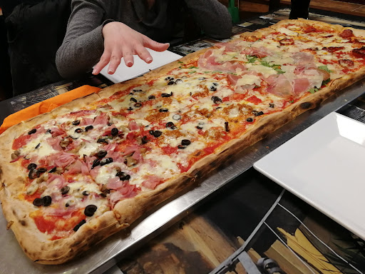 You may ask for "meters" of pizza (a rectangular shaped pizza), from 4 to 16 different tastes. 1 meter of pizza is equal to approximately 16 pieces, that are good for 3/4 hungry people. The cost of a meter of pizza is about 35/40€.