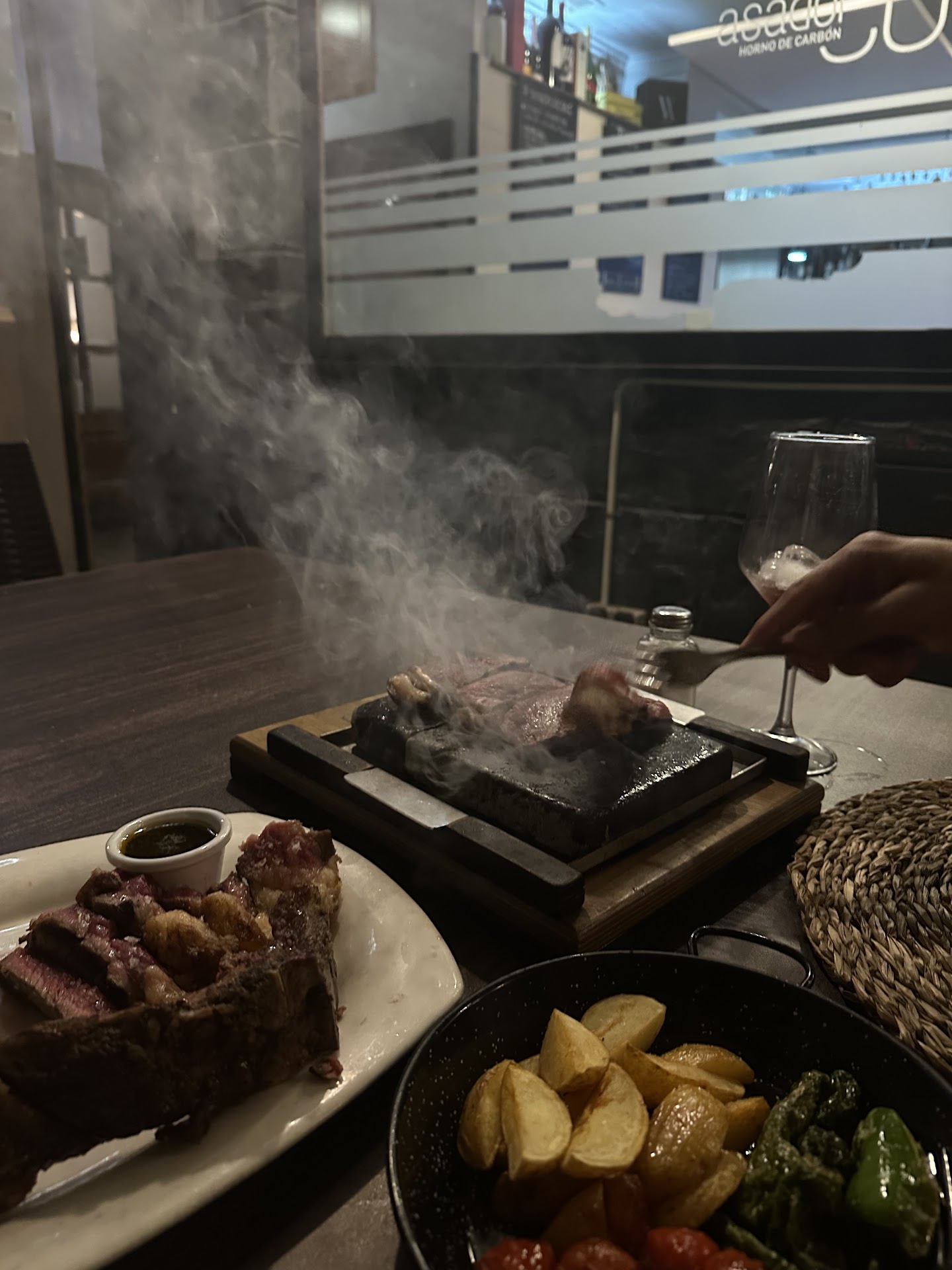 La carne a la piedra fue otro punto destacado de la experiencia gastronómica en Asador Curro. La carne, de primera calidad, se cocinaba a la perfección en una piedra caliente, lo que permitía un control total sobre la cocción. El resultado fue una carne jugosa y llena de sabor, que se derretía en la boca. Sin duda, un deleite para los amantes de la carne.