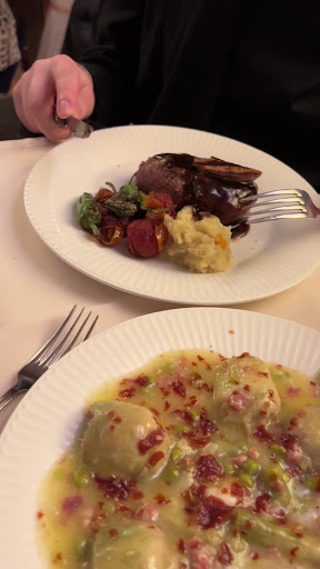 Servers are clumsy and pushy, came three times within minutes to see if we were ready to order. Food was very basic not bad but not great either with no effort on plate presentation. The portions are huge to the point of being disgustingly huge. Husband ordered pork cheeks, they were humongous and were set on a plate with a sauce and that is it. Not a singly vegetable or at least some mashed potato or rice to mop up the sauce. Just giant pieces of meat. I had a fish with a pretty boring white sauce. Again no vegies. Neither one of us could finish our plates.