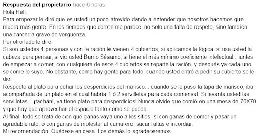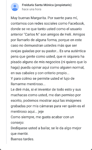 Está mintiendo al decir que yo no he estado en su local. La prueba la puede encontrar en sus cámaras de seguridad que tan extrañamente menciona. Y respecto al tal Carlos N que nombra, no sé quién es, pero no me extraña que la manera de responder del propietario genere aversión.