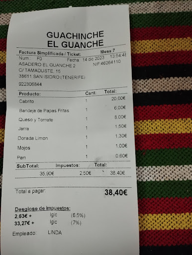 Read morePor dónde empezar? El nombre no coincide con lo que marca Google. No hay carta donde puedas ver los precios ni los platos que tienen, pero el camarero te recomienda cosas por encima, lo que nos hizo fiarnos. Te habla de política y parece estar ebrio. Por una botella de agua de 1L, una coca-cola, una carne fiesta (abundante pero seca), unas patatas fritas (que no habíamos pedido pero que cobró como si fueran aparte de la carne) y un plato de queso con tomate 33€. Nuestra sorpresa fue que cuando nos llegó el ticket, no solo nos pareció caro, sino que la comanda no coincidía con lo que habíamos pedido. Le dijimos que estaba mal y nos dijo que su compañero se había equivocado pero que el precio era ese. Quizás fue culpa nuestra no reclamarlo en el momento pero nos quedamos totalmente "en shock", no lo esperábamos, y mucho menos de un lugar donde critican los altos precios de otros lugares de la isla. Nos sentimos timados por ser turistas. No volveremos y no lo...