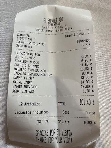 Read moreComida canaria con tradición tal como te cuentan cuando te sugieren los platos de la carta. Estaba todo muy rico, con un servicio muy amable y atento. El chorizo de perro como picoteo de la casa riquísimo. El bocata de sardina muy bien y las carnes riquísimas. Sin duda un sitio que si estás visitando la isla debes acercarte para degustar su carta y vivir...