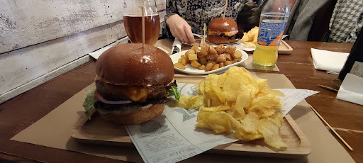 Read moreBuena experiencia en este bar, que no hace mucho era tienda de electrodomésticos, y como mi mujer ya había estado, me lo a recomendado y la verdad es que a sido una buena experiencia, bien por ellos, personal muy agradable y simpático, no e tenido la oportunidad de fijarme en si los aseos están preparados para personas con movilidad reducida y lo siento, por que es una de las cosas que más me gusta mirar, pero siendo el sitio que es diría que si, eso sí, no hay ningún problema para entrar con silla de rueda ya que está todo a ras de suelo, algo que me a llamado la atención es el suelo de madera, creo que imita a lamas de madera de palets con escritura en algunas lamas, me a gustado mucho y sin duda es un sitio que volveré, comentar que las amburguesas no bajan de 200 gramos y otro detalle que agradezco es el palillo en el centro, para evitar que pase como en otros sitios, que la amburguesa vaya por un sitio y el resto por otro, el pan tampoco es el típico de otros sitio, es bastante mejor, en cuanto al precio, decir que dos amburguesas con dos cervezas y una ración de bravas, 21 €, creo que más o menos en línea con el resto de establecimientos, que se dedican a estas comidas, sitio...