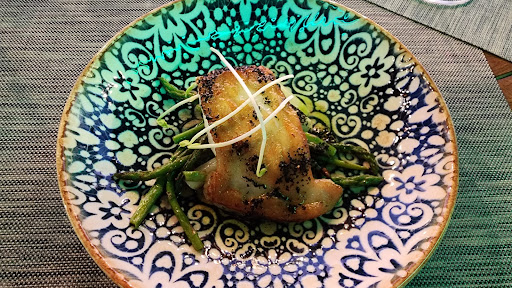 Una ensalada que bien podria ser un segundo plato de mucha categoría, tomate de la zona estos por la temporada , los nax de bruixa , nariz de bruja por los raros que son, pero el sabor es a tomate de los de antes, de lo que no se encuentra ya, esta ensalada templada con langostinos , recién cocidos, en su punto, langostino fresco, además con unos trozos de aguacate, unos trozos de higos de la zona , un helado de tomate raff, y un picadito de verdura al dente, zanahoria, judia y raiz de nabo , un crujiente verde y rico, mezclum de buenas lechugas y aceite rico de arbequina, una ensalada que como dice un cocineto famoso ... Brutal.