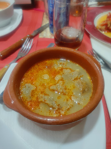 Sopa de Grazalema buenísima. Salmorejo muy rico. Ensalada de pimientos contundente y de calidad. Las pechugas de pollo se deshacían en la boca y a la parrilla. Las albóndigas espectaculares, se deshacían en la boca y hacía siglos que no comía unas tan buenas. El churrasco de pollo brutal, riquísimo y se deshacía en la boca. Los postres, la tarta de queso y el flan, que se quiten en sombrero de lo buenos que estaban ambos.