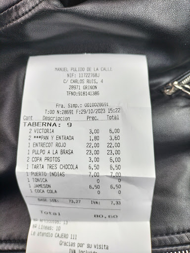 Read moreHola buenas tardes me dirijo a todos ustedes que buscan un lugar para comer , cenar ect.. hoy hemos estado en el spa termar de griñon y al salir que era la hora de comer hemos decidido apostar por la TABERNA DE GRIÑON y he de decir que ha sido la mejor elección porque tienen menú de fin de semana 25 euros , hemos comido súper bien de primero hemos comido unos canelones de boletus y foie que estaban tremendamente buenos exquisitos y muy buena y bonita presentación en plato, ANÉCDOTA ( le he gastado una broma al jefe, son saber que era el , él jefe diciéndole que me había quedado con hambre de más canelones 😂, de segundo yo me había pedido huevos con patatas, con gulas y gambas y cuál ha sido mí sorpresa cuándo veo que vienen con mi plato digo madre mía esto no es para mí donde váis le digo a la camarera de hay podían comer cuatro personas 😂😂) , por supuesto también muy rico también 🥰, mí marido y un amigo se han pedido un entrecot de una carne buenísima , tierna se deshacía en la boca porque yo también la he probado y brutal , además a mí marido le gusta al punto más bien Casi cruda para saborear la carne y he de decir que es el primer sitio en sus 43 años que se la ponen a su gusto 🥰, el trato de la camarera y del jefe maravilloso y el ambiente fantástico y muy agradable 😍 animesen a ir porque no se arrepentirán lo prometo....