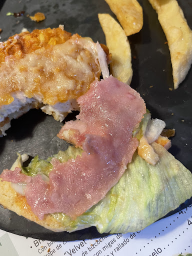Procedo a explicarlo todo más detalladamente… Mi novio y yo pedimos dos hamburguesas y unos “Pops de Pollo” Mi hamburguesa era una de Pollo con Rebozado Panko (9.90€, patatas incluidas): -La carne era un nugget de pollo gigante (pasta industrial de pollo y pan) con un rebozado industrial de cereales comunes. Con lo que vale uno se esperaba una pechuga con un un rebozado Panko casero, no algo congelado. -Tenia también una loncha de Jamón York del Mercadona (no llegaba ni a jamón cocido) y un queso desconocido de exactamente la misma forma y dimensiones que el jamón york. -La lechuga estaba oxidada. Al menos el tomate estaba fresco. -Las patatas incluidas estaban fritas sólo una vez pero al menos no eran congeladas.