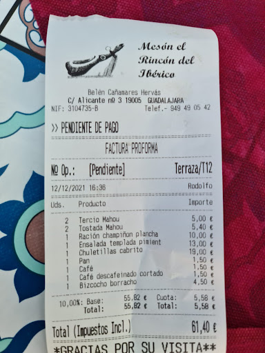 Read moreBuenos días. Me han gustado mucho las veces que he comido aquí. Son encantadores, sobre todo l@s dueñ@s, con los que al principio no tuve el placer de tratar, porque en la terraza suelen estar únicamente los camareros. Como sugerencia, creo que ampliar un poco la zona de terraza, y adicionalmente rebajar un poco los precios, podría ser bueno para el negocio. En cuanto al nombre, rincón y mesón suenan a pequeño y poca cosa, y si cambiasen un poco esto, reflejarían lo que es, a mí gusto, uno de los mejores restaurantes de Guadalajara, donde, además, los niños pueden jugar en el parque que hay pegado...