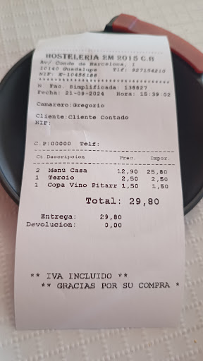 Read moreBuscábamos un sitio para comer, muchos cerrados y llegamos a este, al entrar muchos paisanos del lugar tomando algo y comiendo. Eso siempre es buena señal. Pedimos el menú normal, la comida muy rica, a mayores pedimos la morcilla, buenísima eso si, pica un poco. Los camareros muy amables. Como curiosidad, el agua era de mi pueblo… un tanto lejos de aquí....