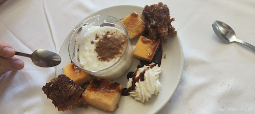 Lo unico que mejoraría serian los postres ya que el arroz con leche deja un poco que desear, se queda un poco aguado, como que no están bien integrados los ingredientes y a la gente escrupulosa le da mucho asco que todos metamos la cuchara en un mismo recipiente. El bizcocho normal y el resto insípido. En este punto me parece un poco quién mucho abarca poco aprieta; quizá un arroz con leche para comensal bien elaborado, o un trozo mas grande de bizcocho... Que se pudiese elegir, vaya. Porque al final se acaba dejando y es una pena.