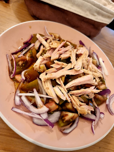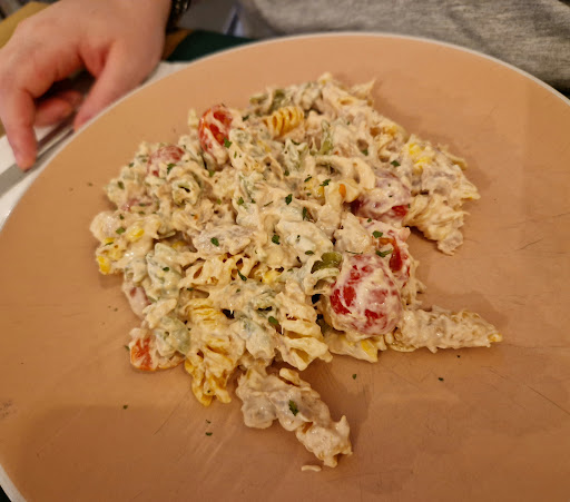 Compartimos todo. Mi pareja comió un menú del día (11.50€) y fenomenal. Eligió ensalada de pasta con salsa rosa y pollo al curry con arroz. Ambos platos estaban riquísimos y las cantidades muy muy bien. No entiendo algún comentario que habla de platos escasos. De postre cogimos arroz con leche, estuvo bueno pero sin más, no lo destacaría
