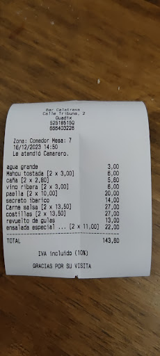 Read moreBar de los de toda la vida, en un local antiguo, abovedado tipo cueva muy pintoresco, con un pequeño salón interior acogedor. Trato inmejorable por parte del camarero, buena carta para comer o para un simple picoteo de tapas a elegir con cada consumición. Los callos, la carne en tomate, las costillas, la careta de cerdo, choto al ajillo, etc. Este fue el resumen que saqué de las valoraciones, y la realidad fue otra. Choto al ajillo no tenían, la carne en tomate, que por lo visto es su especialidad, está claramente súper valorada y las costillas, valiente presentación, cortada a porciones y salada, jamás lo había visto y la paella decepcionante. Y la guarnición de algunos platos (patatas fritas) decidimos cambiarlo por patatas a lo pobre (otra decepción en su elaboración), cobrándonos a parte del precio del plato un suplemento por ello de 1,50€. ! Pero las patatas fritas no nos la descontaron!. Increíble.... Lo único que se salvó fue el revuelto de gulas y el secreto ibérico. Los postres decidimos ni probarlo visto lo visto. El local no estaba lleno, por si pensáis que estaban desbordado. En resumen, se salva el servicio atento y la decoración acogedora, a excepción de los bancos que son super incómodos y la acústica del local ensordecedora (solo había otra mesa de ocho personas al igual que nosotros). En fin, no...