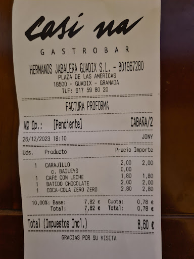 Read moreNo recomendable este antro, no merece la pena ni pasar por la puerta, como consejo de todo corazón, por favor no es un sitio ha donde ir, intentar evitarlo. Hoy, 26/12/2023, salgo con mi familia a tormar un café a este antro, por que otra cosa no parece, después de 28 minutos de reloj, de espera se acerca una muchacha para tomarnos nota, le pido un café con leche, una Coca-Cola, un café con baileys y un colacao con leche sin lactosa y la muchacha me dice que la leche sin lactosa se le acaba de terminar, pues nada colacao con leche normal. Después de 17 minutos de espera nos trae lo pedido o casi, café con leche, Coca-Cola, café solo y batido de chocolate. Le digo que no es lo que hemos podido y ne dice que nunca han tenido colacao y que el baileys se le ha terminado, que es lo que hay. Acepto el pedido por educación y al pedir la cuenta me cobran el café con baileys, lo reclamo y me dicen que lo pague para no hacer un nuevo ticket y que me dan la diferencia, 50 céntimos de euro, después de 15 minutos de espera para que me devuelvan el dinero no me atiende nadie, ASI QUE ENCIMA DE LO PENOSAMENTE ATENDIDOS, PROPINA OBLIGADA O ROBO DE...