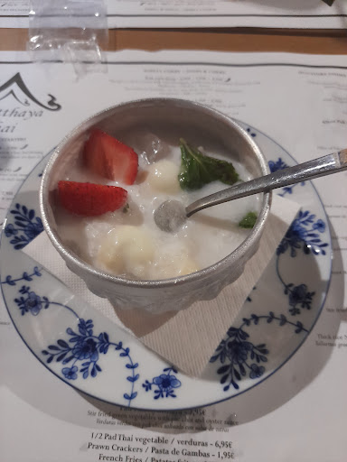Read moreSimplemente de 10. Fuimos a cenar mi marido y yo, no lo conocíamos pero nos pillaba cerca de casa, así que fuimos y resultó todo un acierto. Nos dejamos recomendar por la camarera ( por cierto, majísima y muy atenta) y quedamos encantados. La recomendación fue la siguiente : Massaman de Curry, que es una especie de cremita con patata y gambas muy rica con sabor a coco, un arroz de coco y unos tallarines fritos con pollo ( pad Thai). Pensaba que me iba a quedar con hambre ( somos de buen comer), pero no, quedó el hueco justo para el postre. La camarera de nuevo nos recomendó el postre de mango y el plátano frito. El plátano lo sirven con helado de vainilla, estaba espectacular, me lo comí enterito, el rebozado era un pocoas grueso de lo esperado pero, mmm ¡Qué rico!, El postre de mango se acompañaba con un arrocito como infusionado, según nos explicó la chica, era infusionado con una flor, que era la que le daba un delicado sabor dulce al arroz. A mí no me gusta el mango pero a mí marido le gustó mucho. Todo buenísimo, la verdad es que disfrutamos mucho de la cena porque además de la comida en sí, el lugar es muy agradable y tranquilo. Al final, con 3 vinos y un agua grande salimos por 52€. Un precio más que correcto en mi opinión. A la hora de pagar quisimos pagar con tarjeta y nos dijeron que no tenían para pago con tarjeta, ningún problema porque rápidamente nos ofreció la posibilidad de pagar por bizum, así que genial. En resumen una cena de 10. No dudéis en probarlo, quedaréis muy...