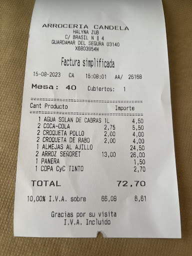 Read moreNo tenemos ningún problema con la comida, al contrario, muy rica. El problema es que pedimos almejas a la marinera que estaban a unos 14€, y la camarera nos dice: no hay, pero pueden ser al ajillo. Nosotros pensamos: bueno, venga, cambian la salsa pero no pasa nada. El susto viene en la cuenta, las almejitas casi 30€...ponemos fotos de ambos precios.