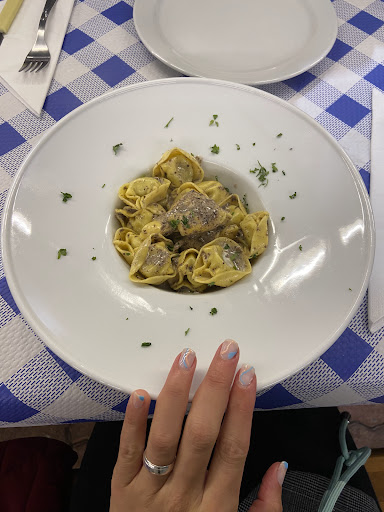 Pasemos a reseñar la comida: Pedimos un plato de pasta y una pizza. La ración del plato de pasta normal, pero le ponen un precio justo. Tortellini en cuanto a sabor, sin más, recordaba a los que compras hechos en el supermercado. La salsa de trufa es lo que le da juego al plato.