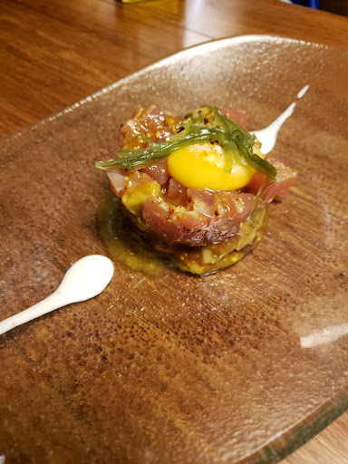 Me ha sorprendido a bien. Creía que el local era pequeño, pero tiene 2 comedores separados. Cada comedor con mesas separadas y bien organizado. Hemos ido ha menú concertado: Calidad precio bien. Gambitas de Huelva a la plancha: En su punto, rico, buena ración, sal... Pulpo a la plancha y su salsa: bien rico. Foie, jamón, hongos, trufa y huevo frito: sin mezclar o mezclado, de las dos maneras queda bien. Mero a la plancha y patata a la "patin": La patata con su bechamel muy rico y el pescado en su punto. Muy muy rico. No hemos dejado ni los huesos!!! Entrecot laminado con patatas y pimientos rojos: las escamas de sal le dan un toque cojonudo. Postre: pastel de café y trufa. Café: un café caliente y decente.