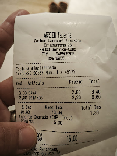 Read moreLlegamos a Guernica a la hora de comer y de casualidad encontramos este sitio.Todo un acierto!!! Cómo turistas, íbamos buscando pinchos y aquí desde luego que los tienen , muy buenos y variados.Lo difícil es decidirte entre tanta oferta.Todos riquísimos,pero el pincho de bacalao una delicia.La cerveza bien tirada y fresquita. Mención aparte merece su propietario.Profesional y amable,nos aconsejó y además,al comentarle que uno de los motivos para conocer el País Vasco,fue visitar San Mamés, (cómo forofos del equipo bilbaíno),tuvo el detalle de regalarnos dos botellas de cervezas conmemorativas del 125 aniversario del Atletic de Bilbao.Si vais por allí,no dejéis de acercaros Totalmente...