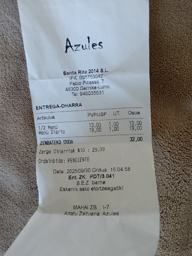My wife and I were visiting Gernika and looking for a spot for lunch when we came across Azures, which fronts a bustling plaza in the heart of this historic city. The place was packed. We got our name on the waiting list, walked around for about 20 minutes and came back. Our table was waiting for us, with linen cloth, glasses and silverware all set up—an excellent start that underscored the service we received. We ordered from the three-course menu for $17 Euros. I started with a bowl of lentils, perfectly cooked with the right of amount of spices, and a fresh roll of bread and glass of red wine. Next up was my main dish: grilled tuna on top of thinly sliced tomatoes cooked in extra virgin olive oil and garnished with caramelized onions. It was all very good. Instead of desert—flan or rice pudding—I had an espresso. We left satisfied and glad that we had given them...