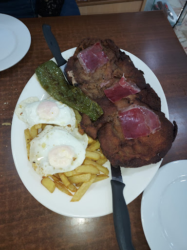 Nefasta experiencia. Llegamos hambrientos. Elegimos de la carta una parrillada pero la camarera nos insiste en que tienen un gran cachopo para dos y que nos va a encantar. Cuando llega el cachopo, vemos que está bastante tostado.Aun así decidimos probarlo.Empezamos por los huevos fritos.Estaban totalmente cuajados y sin yema para mojar.Las patatas fritas, refritas, el cachopo era la suela de un zapato y su sabor avinagrado. La camarera ya ni sale a ver que tal.Nos acercamos a la barra a pagar. Lo comentamos con el camarero y lo único que acierta a decirnos es un "lo siento.Lo hubieran dicho antes que se lo hubiéramos cambiado por otra cosa"...En fin...Son los 18 euros peores invertidos de mi vida. Quien avisa no es traidor.