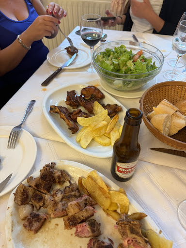 De primero pedimos patatas revolconas y migas, De segundo pedimos chuletón de Ávila. A una mesa que llegó después le sirvieron antes. Las patatas revolconas eran normales, con solo cuatro mini torreznos, tristes e insípidos, una pena.