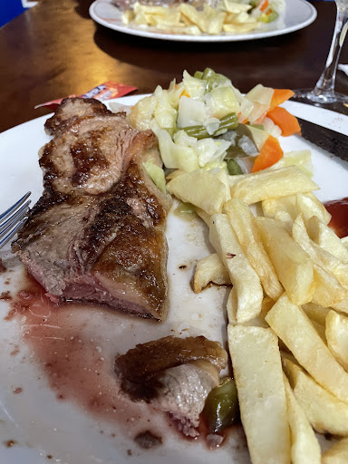 The waiter was unhappy but took the order and a drink order. The food was cooked quickly but the waiter literally threw the plates on the table with a bang. So unprofessional and rude. The steak was delicious, perfectly cooked and full of flavour. The chips reminded me of chippy chips and were very good. The waiter had vanished so I got up and helped myself to ketchup. They don’t do a check back at all in most restaurants, you have to wave if you want anything. When we had finished I asked for the bill and the staff ignored us for 15 minutes so I asked again. 30€ for the meal and 2 wines which was not too bad. Steaks were large and tasty. There does not seem to be toilets and customers and staff use the public toilets up the road. This can’t be hygienic. I would go back as the food was excellent and the miserable waiter may have had a bad day. Still no need for the attitude he had. If he had been more pleasant and explained the fish better we may have been tempted, but having been caught out on “fish of the day” prices elsewhere we...