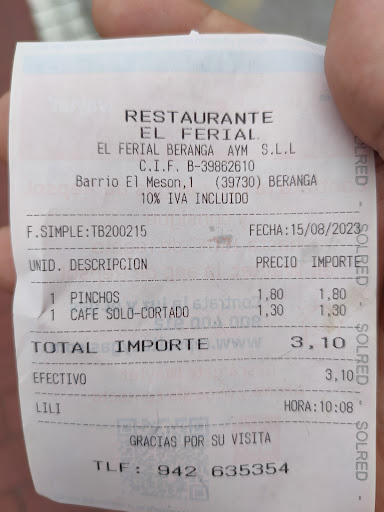 Vivo en Beranga y no suelo frecuentar mucho los bares, hoy me acerco al Ferial a desayunar y me encuentro una mujer con muy mal trato, la pido una café solo largo con sacarina y me lo sirve con azúcar, le pido que me de sacarina en vez de azúcar y le pregunto cuáles son los pinchos de tortilla de mala formas me traen la sacarina y me dice cuáles son las tortillas a lo cual no me atiende. Qué le tengo que volver a pedir la tortilla que quiero y le digo que me cobre a lo cual me cobra 4 euros le pido el ticket y en el ticket vienen dos pinchos y ningún café. Obviamente solo reclamo que yo he tomado un café y el pincho de tortilla y me viene con un ticket novo en el cual me cobran 3 euros 10. Por eso mi calificación es tan mala ya que el trato fue nefasto vale y encima si no lleva reclamar el ticket me habría cobrado demás. Mal trato y servicio...