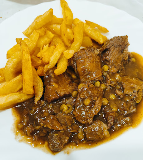 Decir que es comida casera lo dicen muchos, pero aquí de verdad lo es: casera, sabrosa y de calidad, hecha a fuego lento, con ese cariño que ya casi no se encuentra. Probamos unas alubias rojas que estaban tan buenas que dejé el plato limpio, como recién fregado. De segundo, una carne guisada con guisantes, tierna hasta el infinito. También pedimos un filete de ternera a la plancha, que sorprendentemente estaba igual de tierno y lleno de sabor.