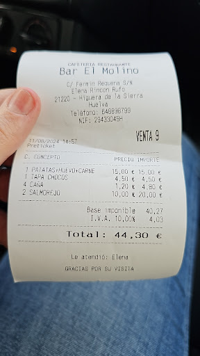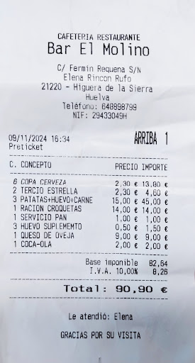 Read moreEstoy indignadísima. Si sois de fuera del pueblo !No vengáis a comer! Resulta que comes lo que la dueña diga. Muy simpática nos pone dos cuenquitos de salmorejo que eran pequeños (qué pena que no les hice foto), un plato de papas con huevos y lomo, y una tapita de adobo; sin saber los precios de nada; no nos dieron carta. La cuenta cuando llegó, me quería cobrar 12€ por cada cuenco de salmorejo. 12€, ¿estamos locos? Le digo: señora, ha sido un cuenquito y muy pequeño; y me dice: más no te puedo rebajar; a 10€ he pagado cada cuenco y ni bueno estaba. Ni en el centro de Sevilla he pagado tanto por una tapa. En definitiva no vayáis o no confíes en ellos. Mirad bien la carta y precios. La gracia de todo es la respuesta del propietario. ¡Qué...