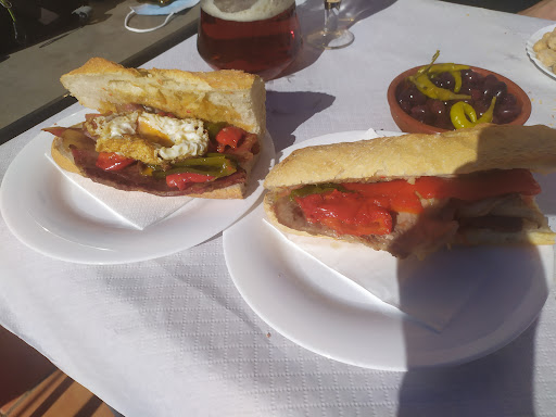 Luego, vino el marido a explicarnos "lo poco" que le quedaba, como casi disculpándose (era un martes cualquiera). Creo que nos dijo unas 8 opciones, si no alguna más. Yo me decanté por un bocata de panceta madurada con pimientos y huevo, y mi pareja se pidió otro de secreto, también con pimientos. Previamente, nos pusieron una cantidad absurda, por lo abundante, de cacaos, olivas y guindillas.