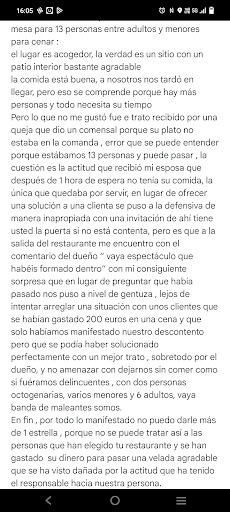 Quiero trasladar mi experiencia en este restaurante, mesa para 13 personas entre adultos y menores para cenar : el lugar es acogedor, la verdad es un sitio con un patio interior bastante agradable la comida está buena, a nosotros nos tardó en llegar, pero eso se comprende porque hay más personas y todo necesita su tiempo Pero lo que no me gustó fue e trato recibido por una queja que dio un comensal porque su plato no estaba en la comanda , error que se puede entender porque estábamos 13 personas y puede pasar , la cuestión es la actitud que recibió mi esposa que después de 1 hora de espera no tenía su comida, la única que quedaba por servir, en lugar de ofrecer una solución a una clienta se puso a la defensiva de manera inapropiada con una invitación de ahí tiene usted la puerta si no está contenta, pero es que a la salida del restaurante me encuentro con el comentario del dueño “ vaya espectáculo que habéis formado dentro” con mi consiguiente sorpresa que en lugar de preguntar que había pasado nos puso a nivel de gentuza , lejos de intentar arreglar una situación con unos clientes que se habían gastado 200 euros en una cena y que solo habíamos manifestado nuestro descontento pero que se podía haber solucionado perfectamente con un mejor trato , sobretodo por el dueño, y no amenazar con dejarnos sin comer como si fuéramos delincuentes , con dos personas octogenarias, varios menores y 6 adultos, vaya banda de maleantes somos. En fin , por todo lo manifestado no puedo darle más de 1 estrella , porque no se puede tratar así a las personas que han elegido tu restaurante y se han gastado su dinero para pasar una velada agradable que se ha visto dañada por la actitud que ha tenido el responsable hacia...
