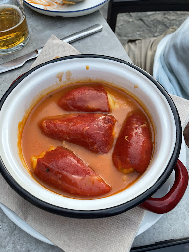 Las raciones son contundentes pero no es la mejor calidad. El rebozado de los calamares era un poco basto, las patatas bravas estaban ok y los pimientos rellenos bastante buenos.